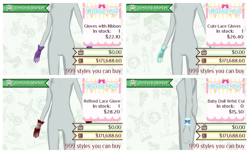 Marble Lily's main image is Baby-Doll and clothing items in the brand also fall under the following images: lively, girly, psychedelic, gothic, feminine and preppy. Lisa returns as the brand representative for Marble Lily in Styling Star. For the Marble Lily brand, each section of clothing contains the following amount of items: